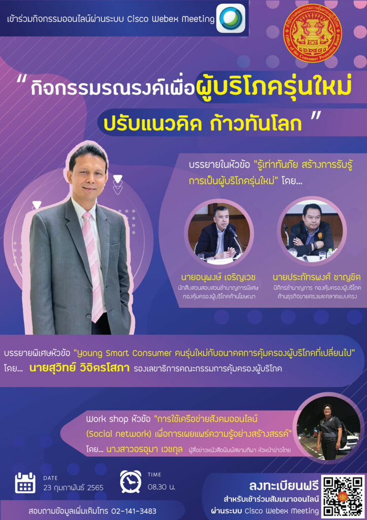 สำนักงานคณะกรรมการคุ้มครองผู้บริโภค ขอเชิญชวนเข้าร่วมกิจกรรม “รณรงค์เพื่อผู้บริโภครุ่นใหม่ ปรับแนวคิด ก้าวทันโลก” ในวันพุธที่ 23 กุมภาพันธ์ 2565 เวลา 08.30 น. เป็นต้นไป ผ่านระบบออนไลน์ Cisco Webex Meeting