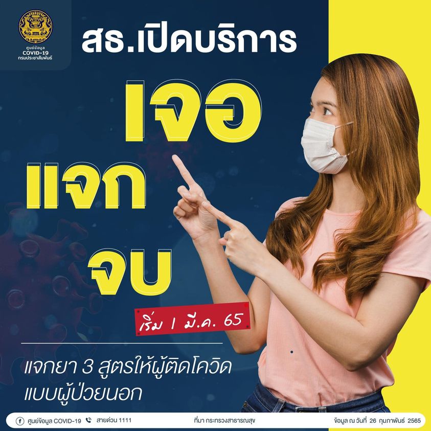 กระทรวงสาธารณสุข เปิดบริการ “เจอ แจก จบ” แจกยา 3 สูตรให้ผู้ติดโควิดแบบผู้ป่วยนอก เริ่มวันที่ 1 มี.ค. 65
