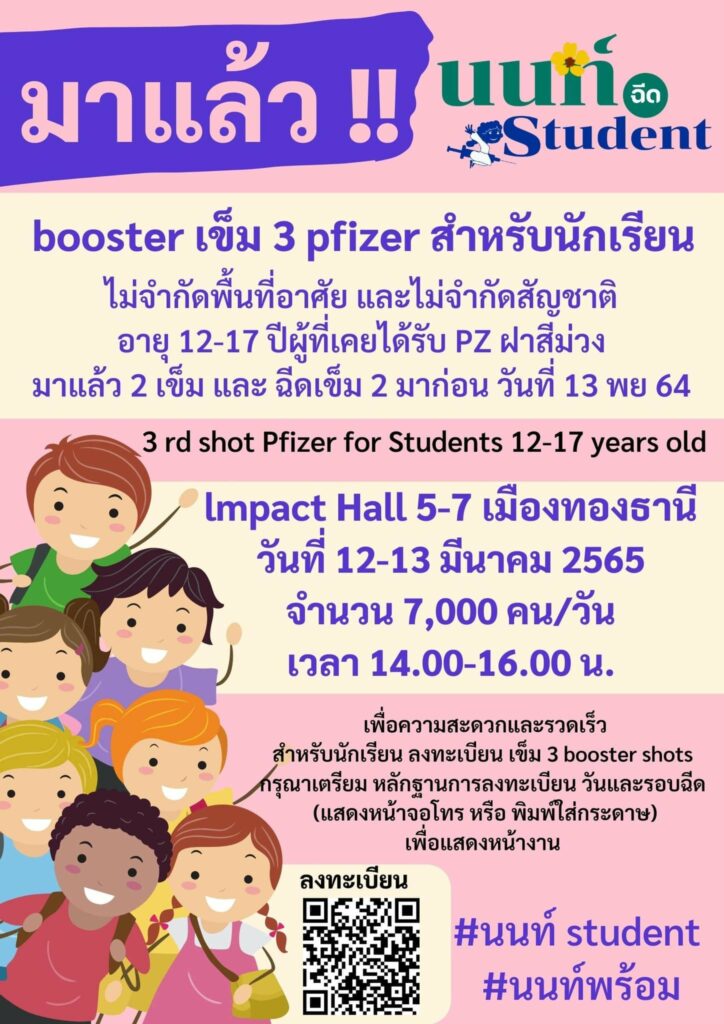 สนามฉีด lmpact Hall 5-7 เมืองทองธานี วันที่ 12-13 มีนาคม 2565 เวลา 14.00 – 16.00 น. เพื่อความสะดวกและรวดเร็ว สำหรับนักเรียน ลงทะเบียน เข็ม 3 booster shots