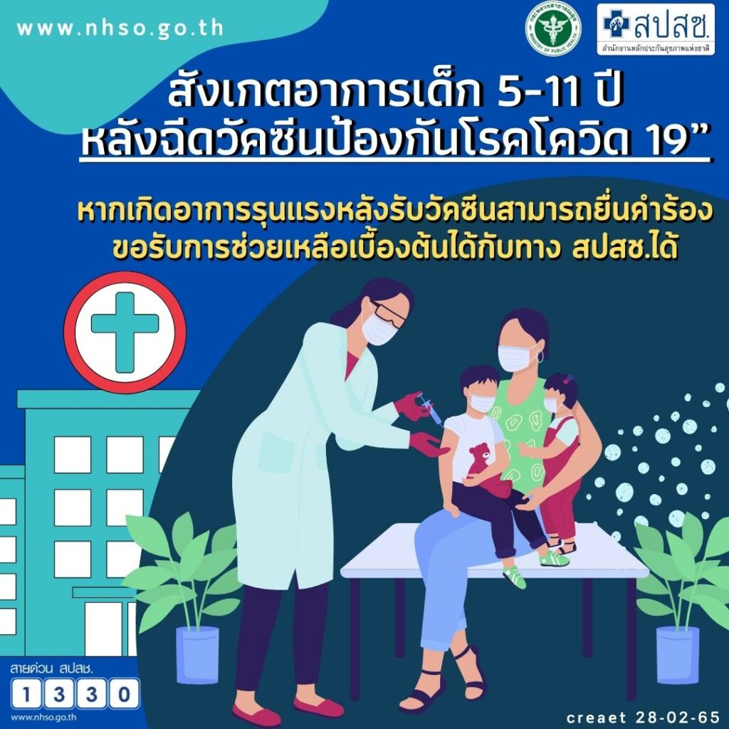 นายแพทย์สมศักดิ์ อรรฆศิลป์ อธิบดีกรมการแพทย์ กล่าวว่า ตามนโยบายกระทรวงสาธารณสุขที่เล็งเห็นความสำคัญของเด็กช่วงอายุ 5-11 ปี เพื่อสร้างภูมิคุ้มกันต่อโรคโควิด 19 ป้องกันการเจ็บป่วยรุนแรงและเสียชีวิต รวมทั้งการกลับเข้าสู่ระบบการศึกษาที่โรงเรียน ส่งเสริมการศึกษาให้ทั่วถึงและเท่าเทียม กระตุ้นพัฒนาการและทักษะทางสังคม ตามความสมัครใจของผู้ปกครองและดุลยพินิจของแพทย์ ผู้ปกครองต้องเฝ้าระวังอาการข้างเคียงหลังฉีดวัคซีนในกลุ่มเด็ก 5-11 ปี โดยอาการที่อาจเกิดขึ้นภายหลังการฉีดวัคซีนไฟเซอร์สูตรเด็ก ได้แก่ ปวด บวม แดง บริเวณที่ฉีด ปวดศีรษะ อ่อนเพลีย มีไข้ ดังนั้น ก่อนการฉีดควรเตรียมตัวเด็กให้พร้อม รับประทานอาหารและน้ำตามปกติ พักผ่อนให้เพียงพอ