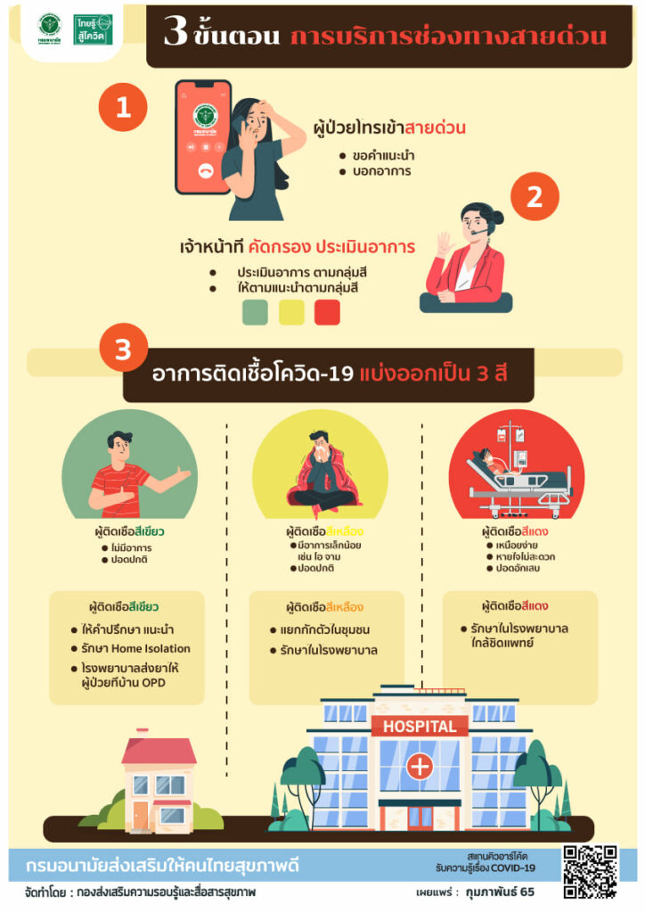 กรมอนามัย แนะนำ 3 ขั้นตอน การบริการช่องทางสายด่วน เป็นช่องทางให้คำปรึกษาผู้ป่วยติดเชื้อโควิด 19