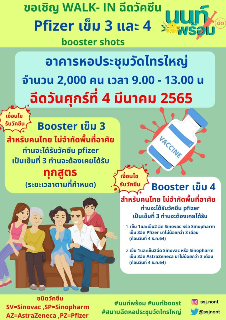 สำนักงานสาธารณสุขจังหวัดนนทบุรี เปิด Walk in ฉีดวัคซีน pfizer เข็ม 3 และ 4 booster shots ฉีดวันที่ 4 มีนาคม 2565 ณ อาคารหอประชุมวัดไทรใหญ่ วันละ 2,000 คน เวลา 09.00 – 13.00 น.