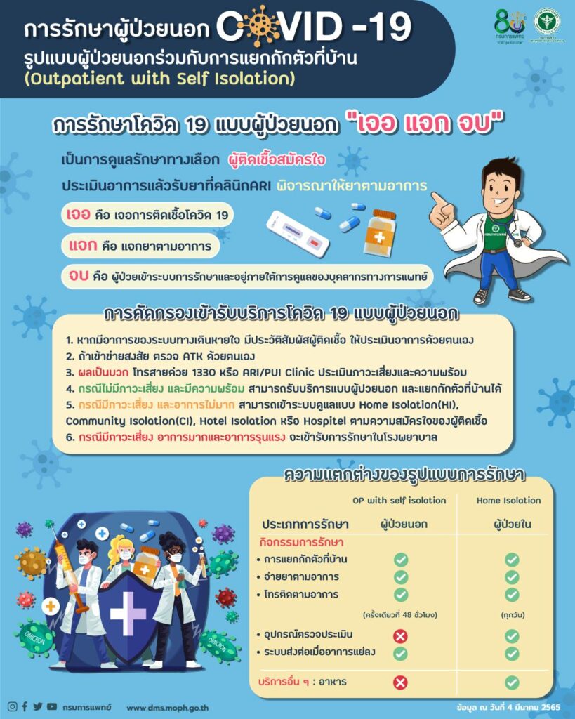 กรมการแพทย์ แนะนำการรักษาโควิด 19 แบบผู้ป่วยนอก “เจอ แจก จบ” รูปแบบผู้ป่วยนอกร่วมกับการแยกกักตัวที่บ้าน (Outpatient with Self Isolation)