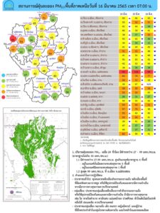 ศูนย์แก้ไขปัญหามลพิษทางอากาศ รายงานการติดตามตรวจสอบคุณภาพอากาศ ประจำวันที่ 16 มีนาคม 2565 ณ 07:00 น สรุปสถานการณ์ PM2.5 พบเกินค่ามาตรฐานใน ภาคเหนือ และภาคตะวันออกเฉียงเหนือ ได้แก่ จ.เชียงราย จ.แม่ฮ่องสอน จ.เชียงใหม่ จ.แพร่ จ.อุตรดิตถ์ จ.บึงกาฬ จ.หนองคาย จ.อุดรธานี จ.สกลนคร จ.ขอนแก่น จ.กาฬสินธุ์ จ.ร้อยเอ็ด จ.อุบลราชธานี และ จ.ศรีสะเกษ สำหรับภาคอื่นๆ ภาพรวมอยู่ในเกณฑ์ดีมาก