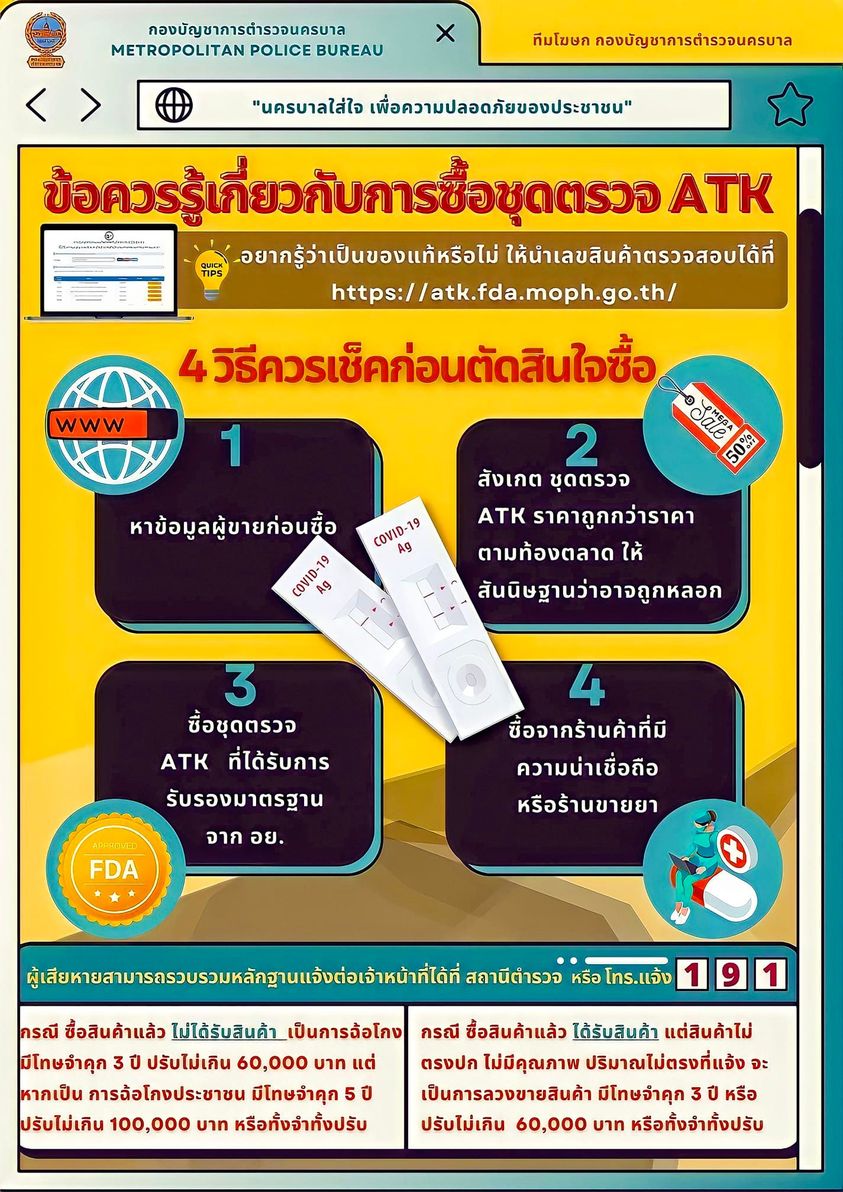 กองบัญชาการตำรวจนครบาล แนะนำ เช็คก่อนซื้อ ไม่ตกเป็นเหยื่อได้ชุดตรวจโควิด 19 (ATK) ปลอม ข่าวสารกิจกรรม, ข่าวไวรัสโควิด-19 กองบัญชาการตำรวจนครบาล แนะนำ เช็คก่อนซื้อ ไม่ตกเป็นเหยื่อได้ชุดตรวจโควิด 19 (ATK) ปลอม กองบัญชาการตำรวจนครบาล แนะนำ เช็คก่อนซื้อ ไม่ตกเป็นเหยื่อได้ชุดตรวจโควิด 19 (ATK) ปลอม ที่มา : https://bit.ly/3KQu6Rm Post Views: 53 FacebookFacebookXTwitterLINELine