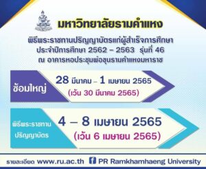 มหาวิทยาลัยรามคำแหงจะมีพิธีพระราชทานปริญญาบัตรแก่ผู้สำเร็จการศึกษา ประจำปีการศึกษา 2562 – 2563 (รุ่นที่ 46) ณ อาคารหอประชุมพ่อขุนรามคำแหงมหาราช