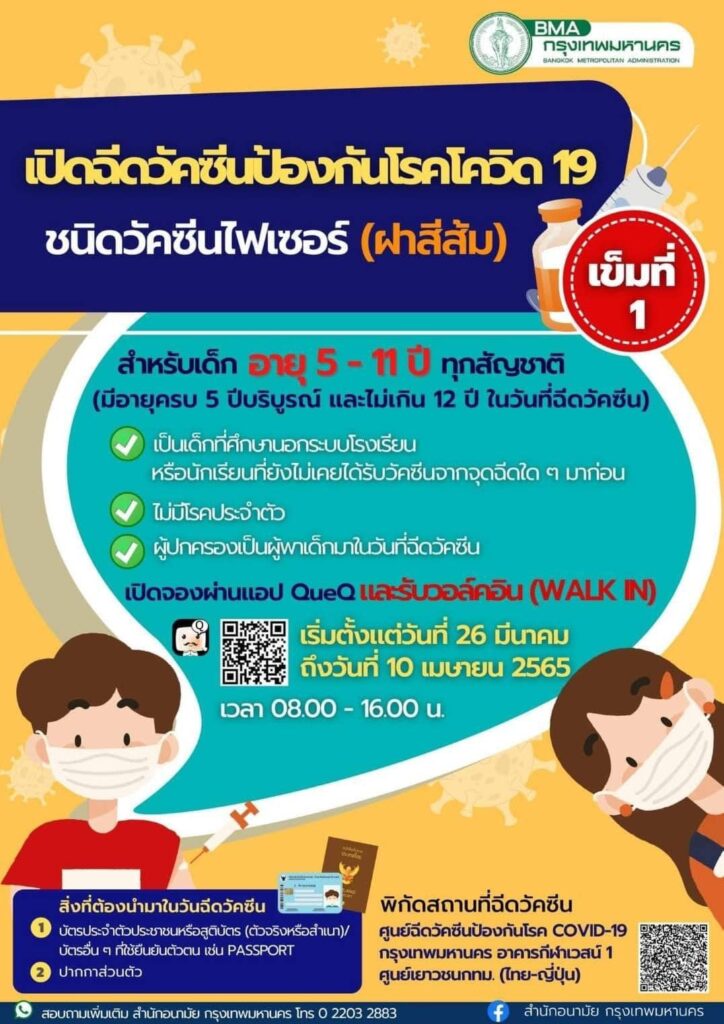 กรุงเทพมหานคร เปิดฉีดวัคซีนป้องกันโรคโควิด 19 เข็มที่ 1 สำหรับเด็ก อายุ 5-11 ปี