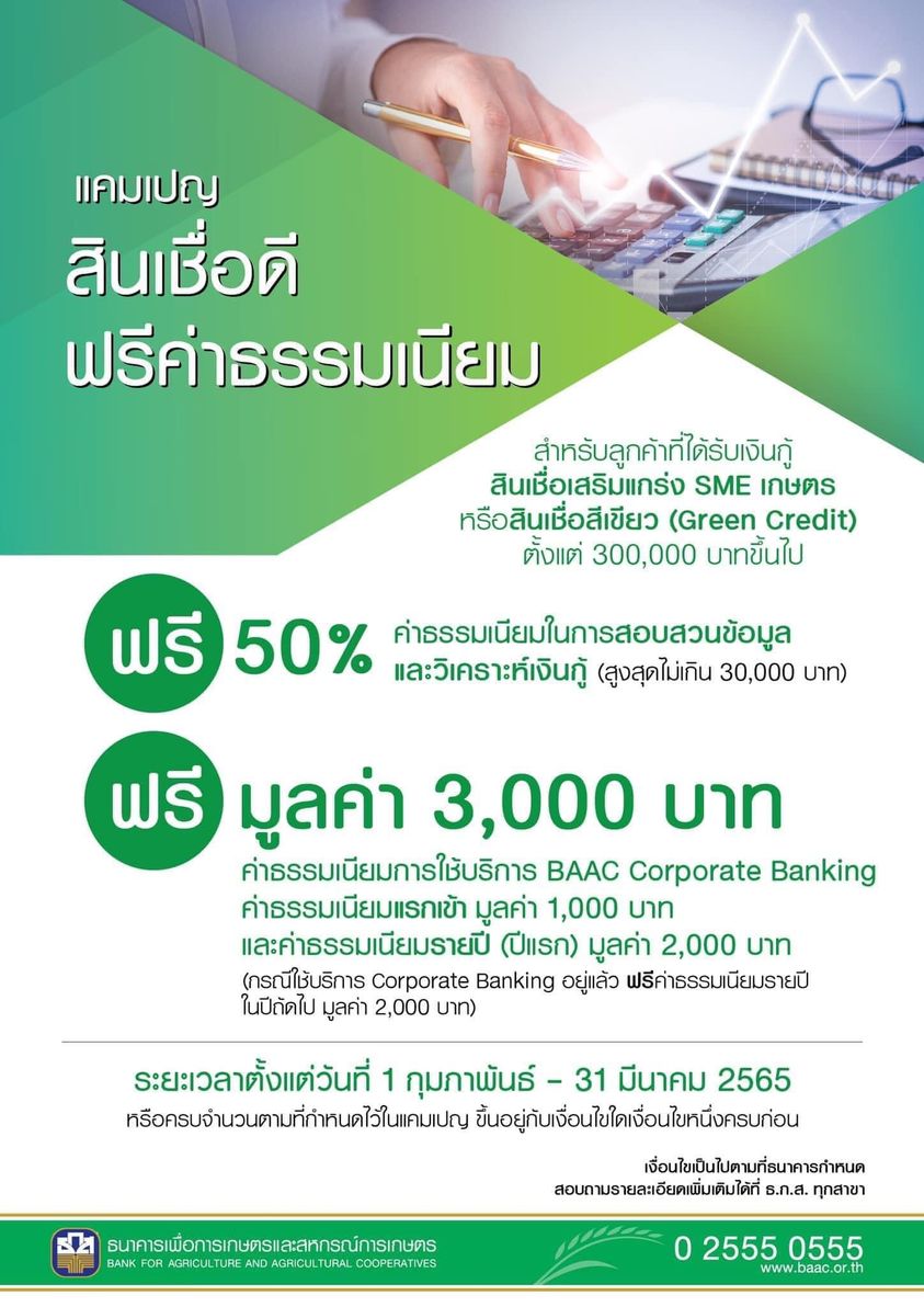 ธนาคารเพื่อการเกษตรและสหกรณ์การเกษตร ธ.ก.ส. จัดแคมเปญ สินเชื่อดี ฟรีค่าธรรมเนียม สำหรับลูกค้าที่ได้รับเงินกู้ สินเชื่อเสริมแกร่ง SME เกษตร หรือ สินเชื่อสีเขียว (Green Credit) ตั้งแต่ 300,000 บาทขึ้นไป