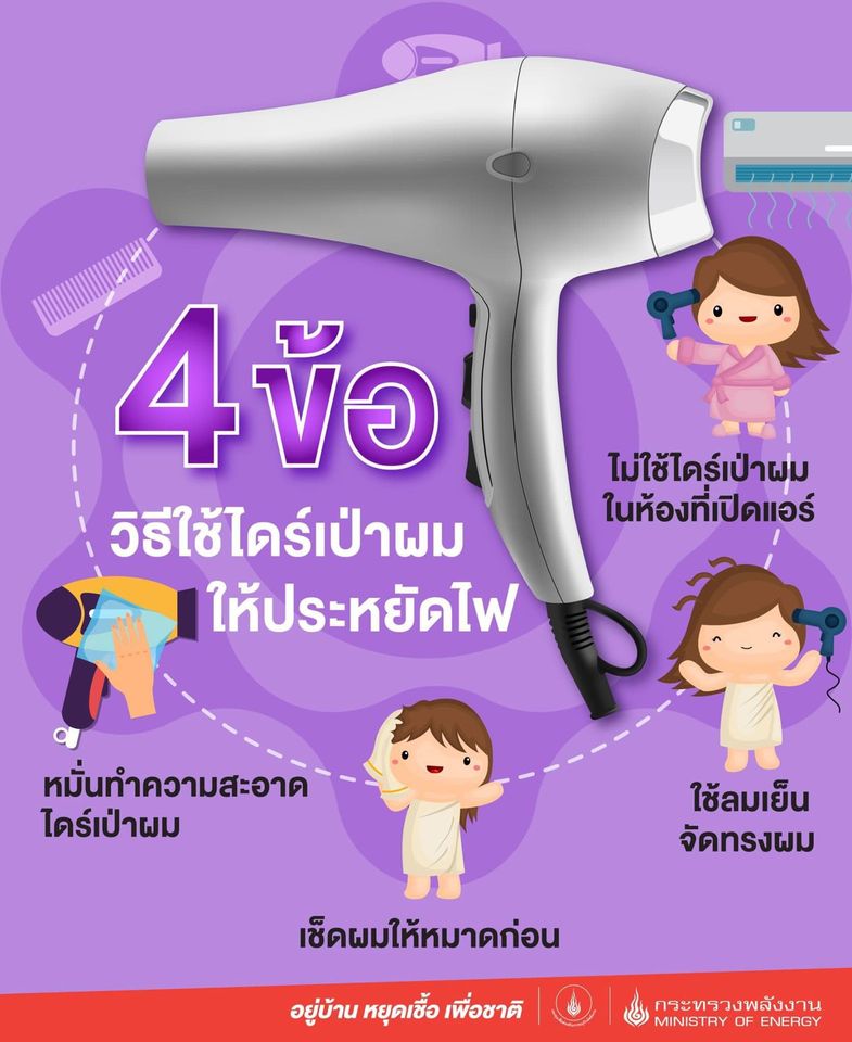 กระทรวงพลังงาน แนะนำ 4 ข้อ วิธีใช้ไดร์เป่าผมให้ประหยัดไฟ ทั้งนี้การใช้ไดร์เป่าผมเป็นวิธีที่ช่วยให้ผมแห้งเร็วขึ้นในช่วง กลางคืน และช่วยจัดทรงผมได้ดีกว่าการปล่อยให้ผมแห้งเองที่จะทำให้ผมชี้ฟู ไดร์เป่าผมหากรู้จักวิธีใช้ที่ถูกต้องจะสามารถประหยัดค่าไฟได้