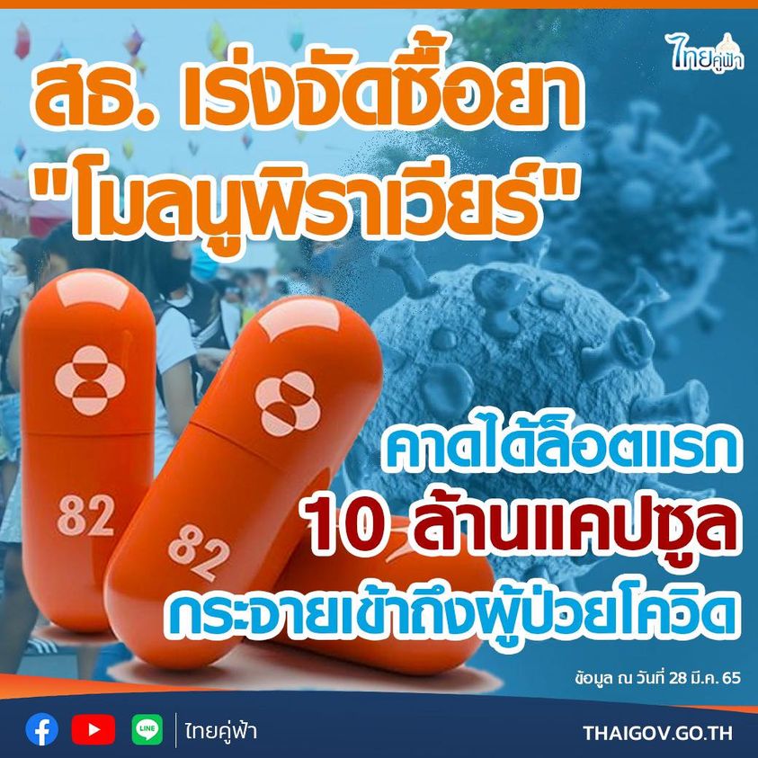กระทรวงสาธารณสุข (สธ.) เร่งดำเนินการจัดหายา โมลนูพิราเวียร์ ยาต้านไวรัสชนิดรับประทาน เพื่อเป็นทางเลือกใช้รักษาโรคโควิด 19 ในกลุ่มเสี่ยงอายุ 60 ปีขึ้นไป ที่ไม่มีประวัติได้รับวัคซีน หรือได้รับวัคซีนเพียง 1 เข็ม ช่วยให้ผู้ป่วยลดความเสี่ยงการเกิดอาการรุนแรง ตามแนวทางการรักษาของกรมการแพทย์