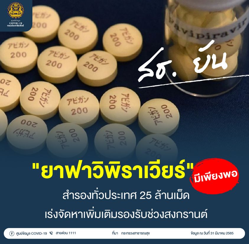 สธ. ยัน “ยาฟาวิพิราเวียร์” มีเพียงพอ สำรองทั่วประเทศ 25 ล้านเม็ด เร่งจัดหาเพิ่มเติมรองรับช่วงสงกรานต์ ข้อควรระวังการให้ยาฟาวิพิราเวียร์ คือ หญิงตั้งครรภ์ โดยเฉพาะช่วงไตรมาสแรกที่จะมีผลกระทบต่อพัฒนาการของเด็กทารกในครรภ์ได้ กลุ่มที่มีปัญหาตับและกรดยูริก รวมถึงผู้ที่รับประทานยาประจำตัวจะต้องปรึกษาแพทย์ เพื่อไม่ให้เกิดผลข้างเคียงต่อตับ สิ่งสำคัญคือต้องใช้ยาอย่างสมเหตุสมผล ไม่ใช้ยามากเกินความจำเป็น เพื่อลดความเสี่ยงเชื้อดื้อยา เลี่ยงโอกาสเกิดผลข้างเคียงจากยา และช่วยประหยัดค่าใช้จ่ายที่อาจเกินความจำเป็น