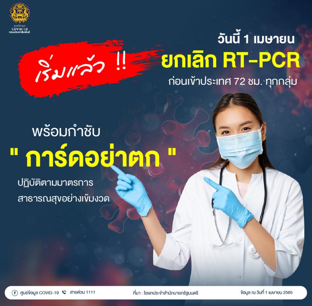 โฆษกประจำสำนักนายกรัฐมนตรี เปิดเผยตั้งแต่วันที่ 1 เมษายน 2565 ยกเลิก RT-PCR ก่อนเข้าประเทศ 72 ชม. ทุกกลุ่ม พร้อมกำชับ ” การ์ดอย่าตก ” ปฏิบัติตามมาตรการสาธารณสุขอย่างเข้มงวด