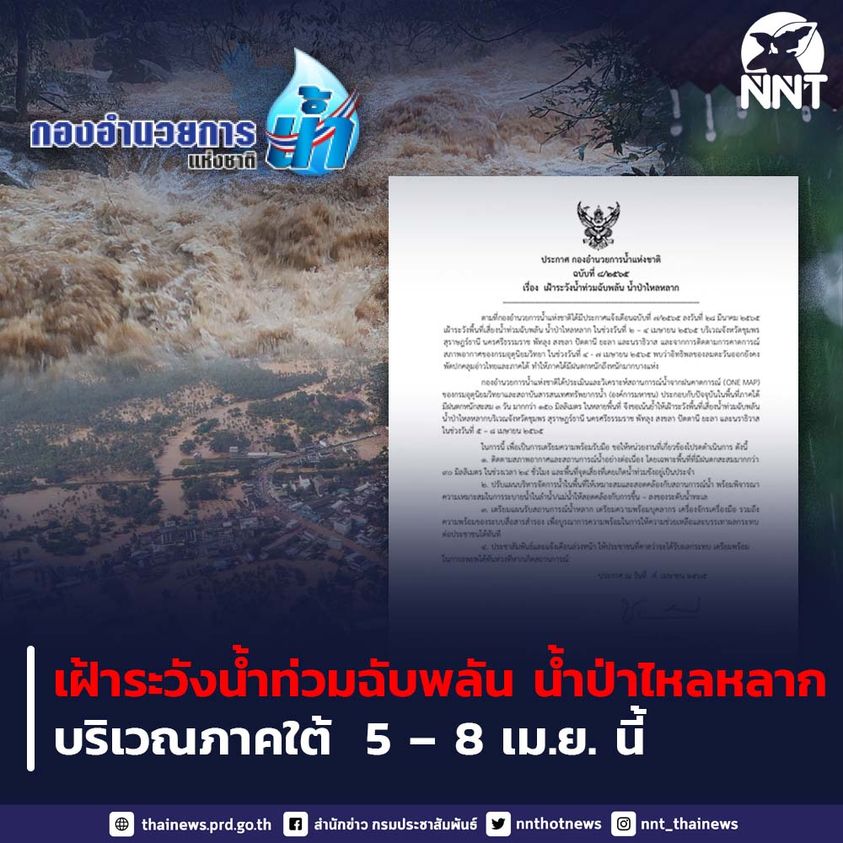 กองอำนวยการน้ำแห่งชาติ เน้นย้ำให้เฝ้าระวังพื้นที่เสี่ยงน้ำท่วมฉับพลัน น้ำป่าไหลหลากบริเวณจังหวัดชุมพร สุราษฎร์ธานี นครศรีธรรมราช พัทลุง สงขลา ปัตตานี ยะลา และนราธิวาส ในช่วงวันที่ 5 – 8 เมษายน 2565