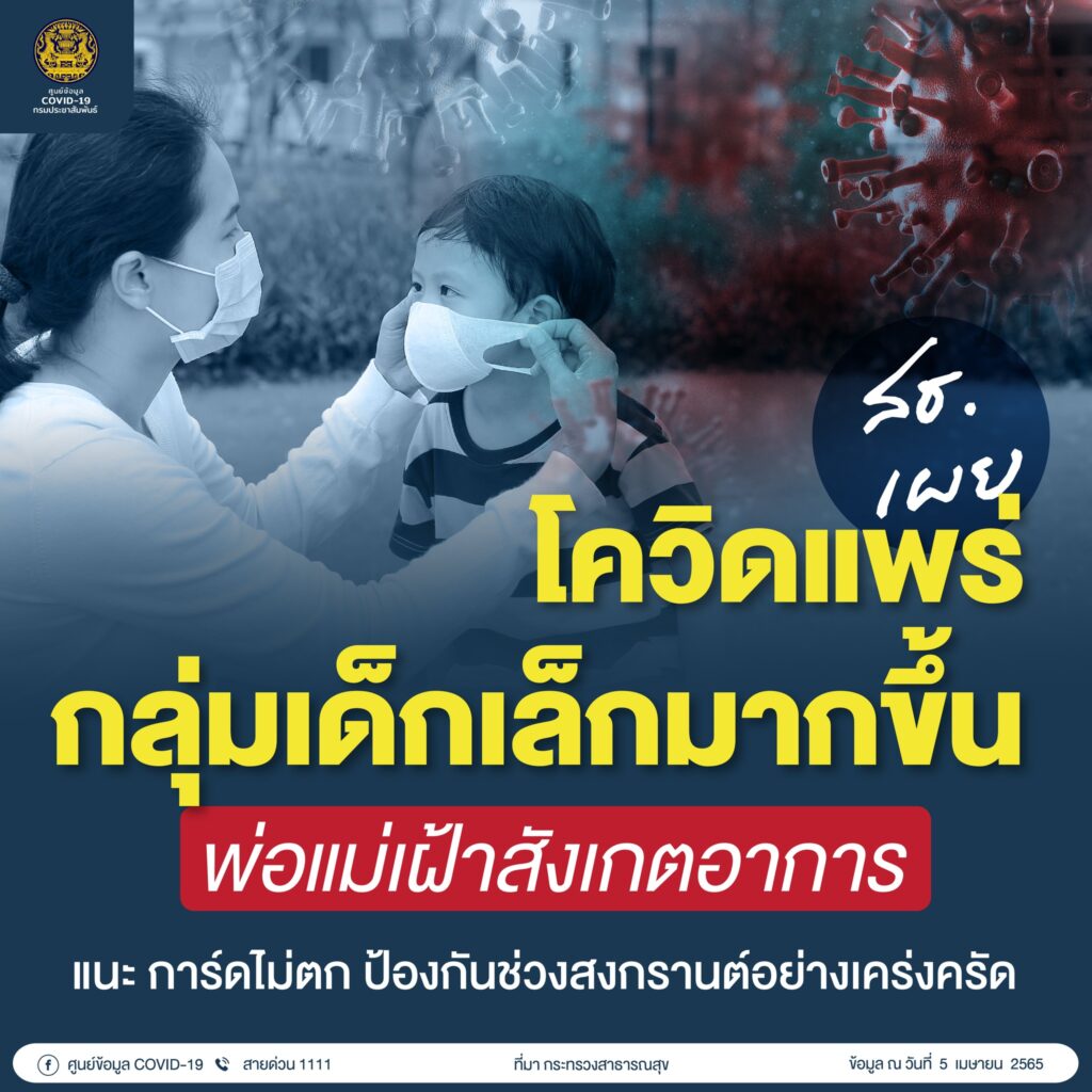กระทรวงสาธารณสุข เปิดเผยโควิด 19 แพร่กลุ่มเด็กเล็กมากขึ้น พ่อแม่เฝ้าสังเกตอาการ แนะนำการ์ดไม่ตก ป้องกันช่วงสงกรานต์อย่างเคร่งครัด
