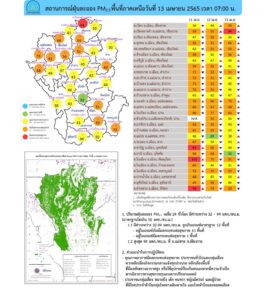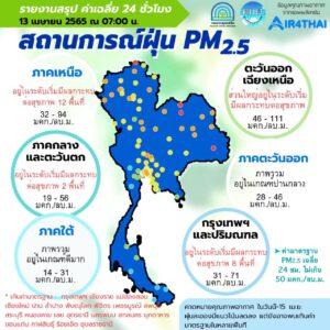 ศูนย์แก้ไขปัญหามลพิษทางอากาศ รายงานการติดตามตรวจสอบคุณภาพอากาศ ประจำวันที่ 13 เมษายน 2565 ณ 07:00 น สรุปสถานการณ์ PM2.5 พบเกินค่ามาตรฐานในพื้นที่ ได้แก่ กรุงเทพมหานคร จ.เชียงราย จ.แม่ฮ่องสอน จ.เชียงใหม่ จ.น่าน จ.ลำปาง จ.พิษณุโลก จ.พิจิตร จ.เพชรบูรณ์ จ.ลพบุรี จ.สระบุรี จ.หนองคาย จ.เลย จ.อุดรธานี จ.นครพนม จ.สกลนคร จ.มุกดาหาร จ.ขอนแก่น จ.กาฬสินธุ์ จ.ร้อยเอ็ด และ จ.อุบลราชธานี