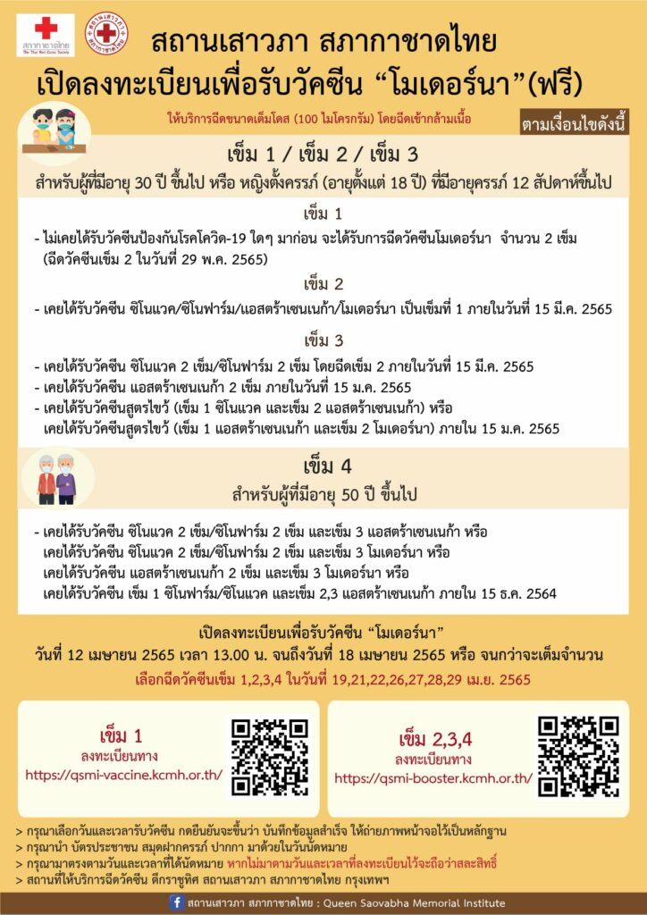 สถานเสาวภา สภากาชาดไทย เปิดลงทะเบียนเพื่อรับวัคซีน “โมเดอร์นา”(ฟรี) ให้บริการฉีดขนาดเต็มโดส (100 ไมโครกรัม) โดยฉีดเข้ากล้ามเนื้อ