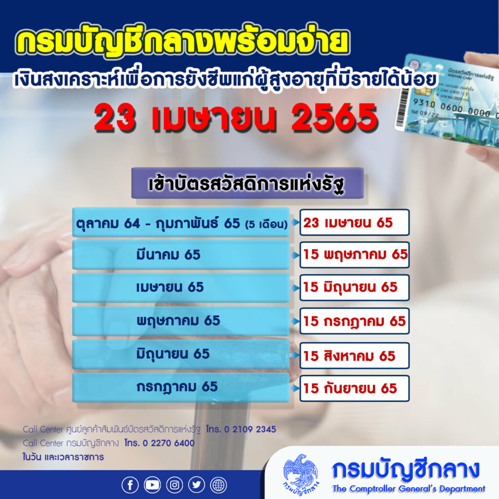 กรมบัญชีกลาง เปิดเผยวันที่ 23 เมษายน 2565 จะเริ่มจ่ายเงินสงเคราะห์เพื่อการยังชีพแก่ผู้สูงอายุที่มีรายได้น้อย (อัตราเดิม) เข้าบัตรสวัสดิการแห่งรัฐ ให้ผู้สูงอายุที่ถือบัตรสวัสดิการฯ ใช้จ่ายได้สะดวกยิ่งขึ้น ตามมติคณะกรรมการบริหารกองทุนผู้สูงอายุ กระทรวงการพัฒนาสังคมและความมั่นคงของมนุษย์ ที่อนุมัติแนวทางการจ่ายเงินฯ สำหรับปีงบประมาณ 2565