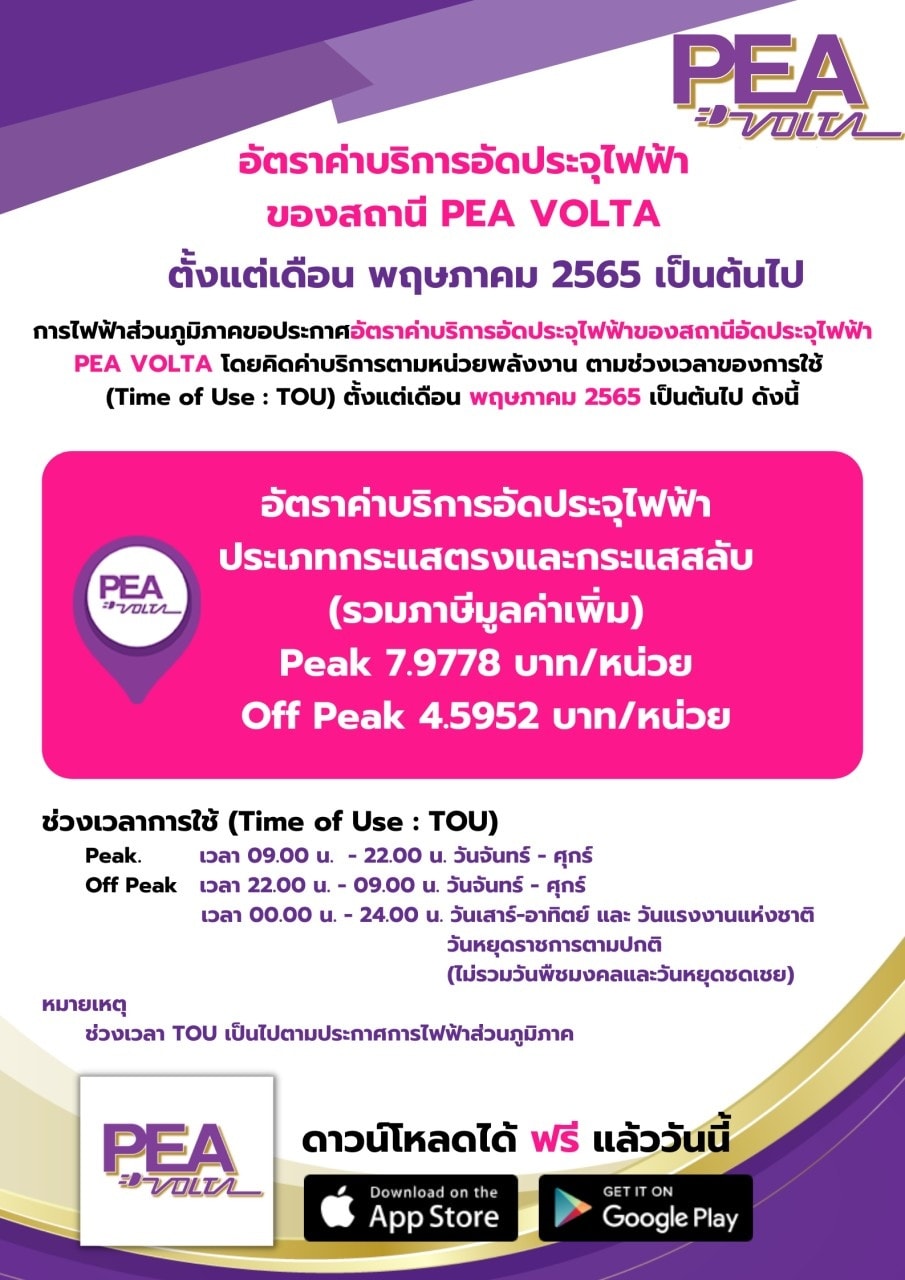 การไฟฟ้าส่วนภูมิภาค ประกาศอัตราค่าบริการอัดประจุไฟฟ้าสำหรับสถานีอัดประจุไฟฟ้า PEA VOLTA โดยคิดค่าบริการอัดประจุไฟฟ้าตามช่วงเวลาการใช้ (Time of Use : TOU) โดยคิดค่าบริการตามหน่วยพลังงานตั้งแต่เดือน พฤษภาคม 2565 เป็นต้นไป ดังนี้