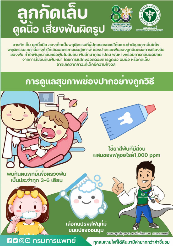 กรมการแพทย์ โดยสถาบันทันตกรรมเตือนผู้ปกครอง สังเกตพฤติกรรมลูกกัดเล็บ ดูดนิ้ว เสี่ยงฟันผิดรูป ฟันซ้อนเก ควรใส่ใจดูแลสุขภาพช่องปากเด็กตั้งแต่มีฟันซี่แรก และพบทันตแพทย์ทุก 6 เดือนเพื่อตรวจและรับคำแนะนำ