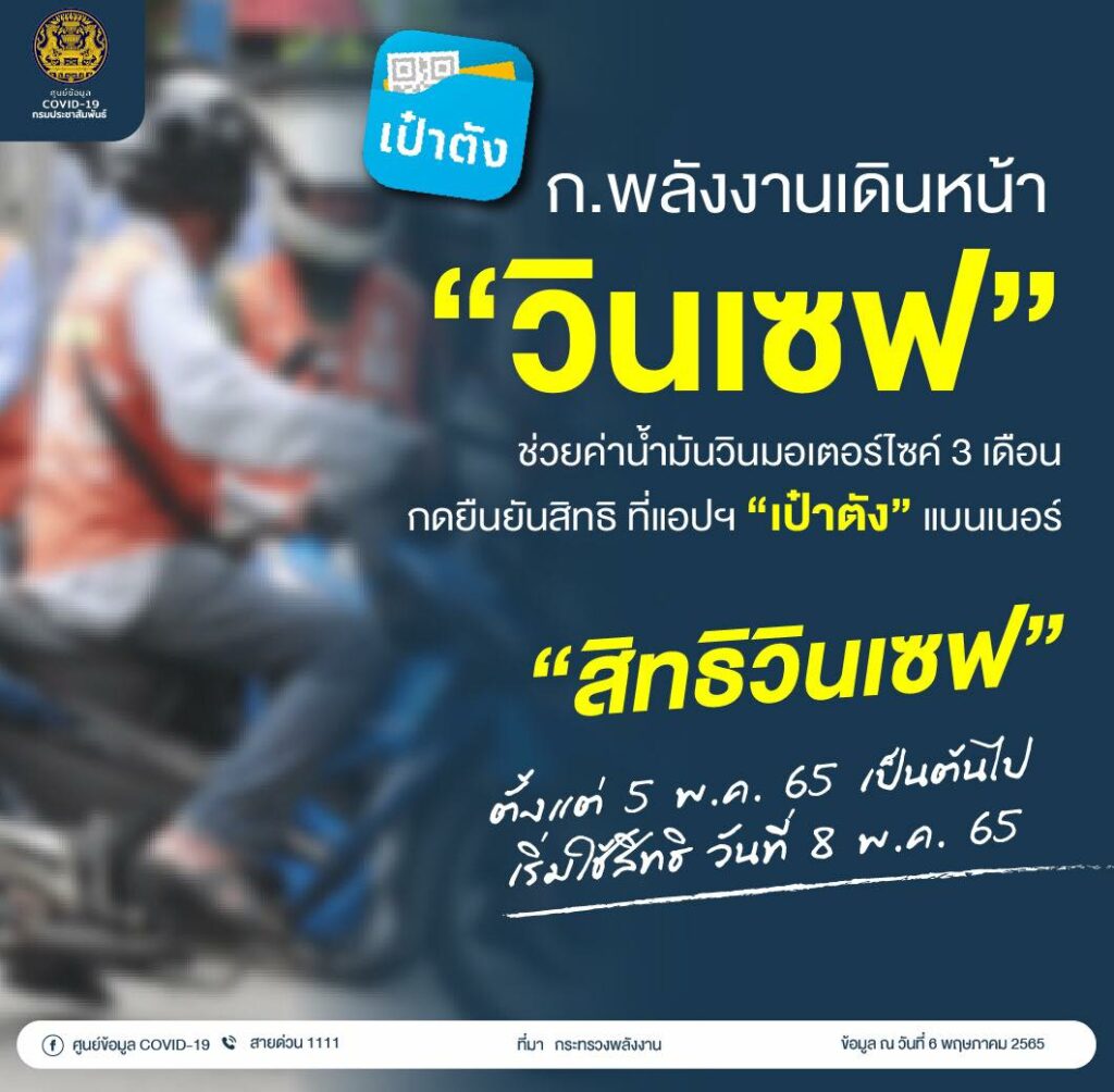 กระทรวงพลังงาน เดินหน้า “วินเซฟ” ช่วยค่าน้ำมันวินมอเตอร์ไซค์ 3 เดือน กดยืนยันสิทธิ ที่แอปฯ “เป๋าตัง” แบนเนอร์ “สิทธิวินเซฟ” ตั้งแต่วันที่ 5 พฤษภาคม 2565 เป็นต้นไป เริ่มใช้สิทธิ วันที่ 8 พฤษภาคม 2565
