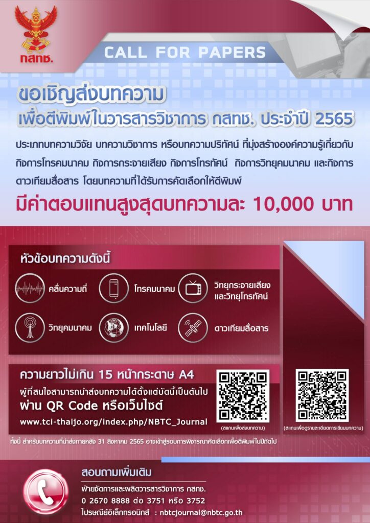 สนใจสามารถนำส่งบทความได้ตั้งแต่บัดนี้เป็นต้นไป ทางเว็บไซต์ www.tci-thaijo.org/index.php/NBTC_Journal