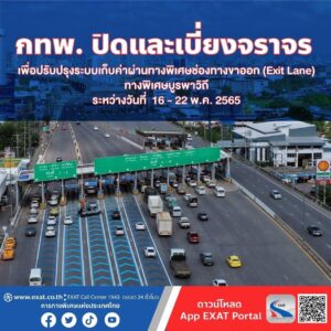 กทพ. ปิดและเบี่ยงจราจรเพื่อปรับปรุงระบบเก็บค่าผ่านทางพิเศษช่องทางขาออก (Exit Lane) ทางพิเศษบูรพาวิถี ระหว่างวันที่ 16 – 22 พฤษภาคม 2565 ดังนี้