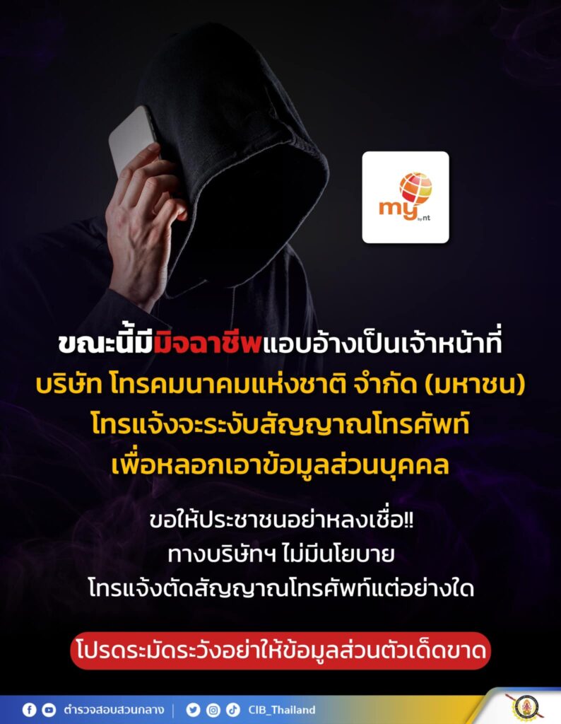 กองบัญชาการตำรวจสอบสวนกลาง เตือนระวังมิจฉาชีพแอบอ้างเป็นเจ้าหน้าที่ บริษัทโทรคมนาคมแห่งชาติ จำกัด (มหาชน) โทรแจ้งจะระงับสัญญาณโทรศัพท์