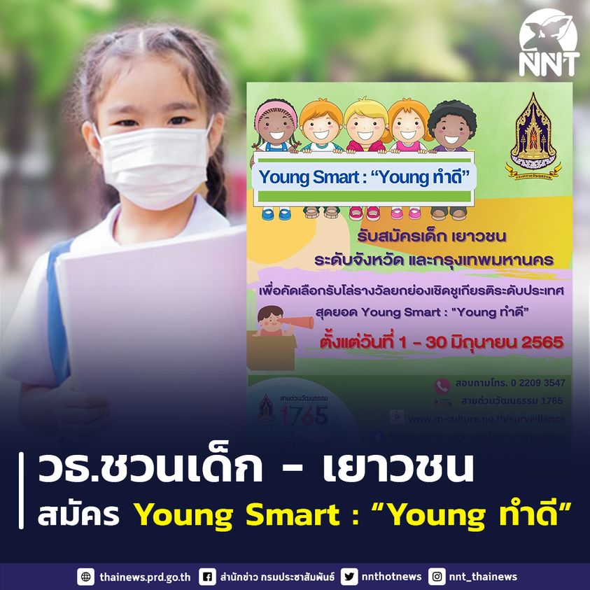 กระทรวงวัฒนธรรม เชิญชวนเด็ก – เยาวชนทั่วประเทศ สมัครกิจกรรม Young Smart : “Young ทำดี” หนุนเยาวชนไทย กล้าทำความดี สนับสนุนคนเก่ง – คนกล้า จิตอาสาพัฒนาชุมชน