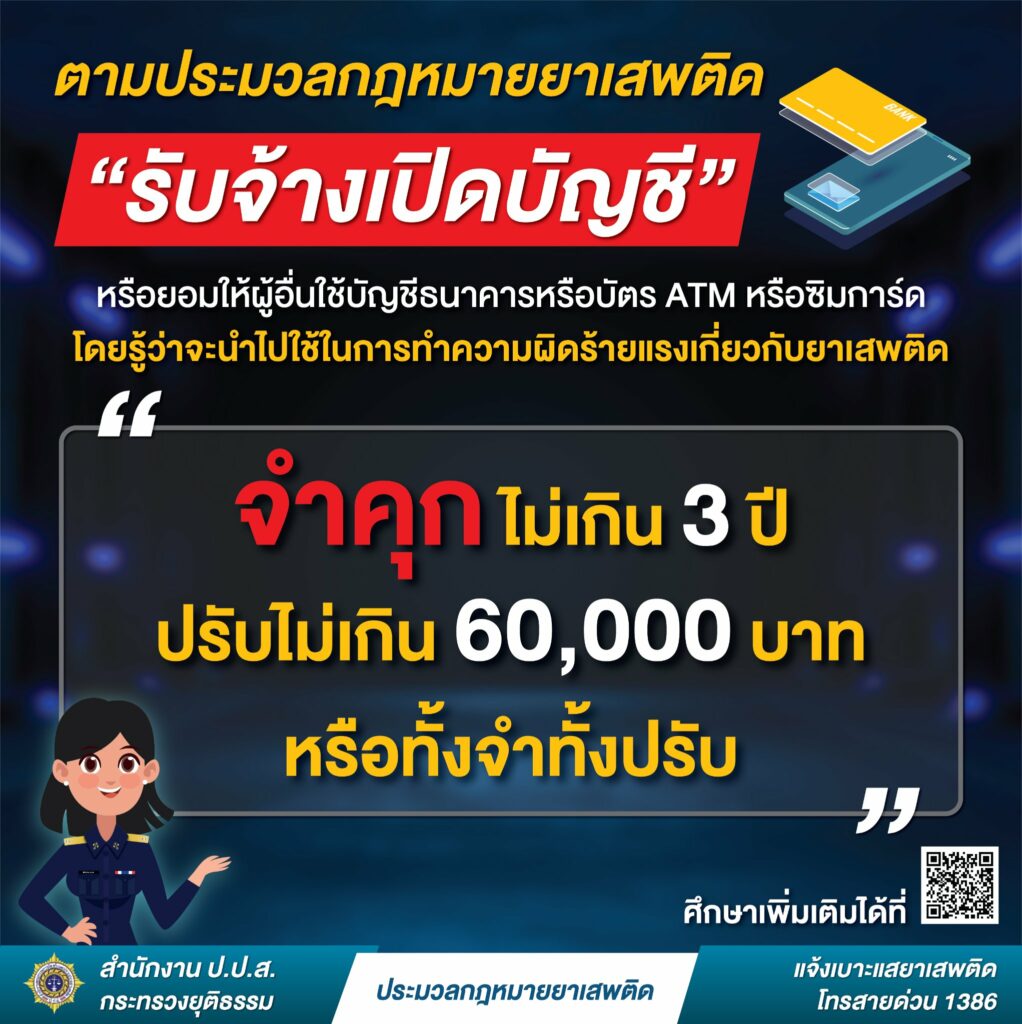 สำนักงานคณะกรรมการป้องกันและปราบปรามยาเสพติด เปิดเผยประมวลกฎหมายยาเสพติดใหม่ รับจ้างเปิดบัญชี หรือ ยอมให้ผู้อื่นใช้บัญชีธนาคารหรือบัตร ATM หรือ ซิมการ์ด โดยที่รู้ว่าจะถูกนำไปใช้ในการทำความผิดร้ายแรงที่เกี่ยวข้องกับ ยาเสพติด ต้องโทษจำคุก ไม่เกิน 3 ปี ปรับไม่เกิน 60,000 บาท หรือทั้งจำทั้งปรับ