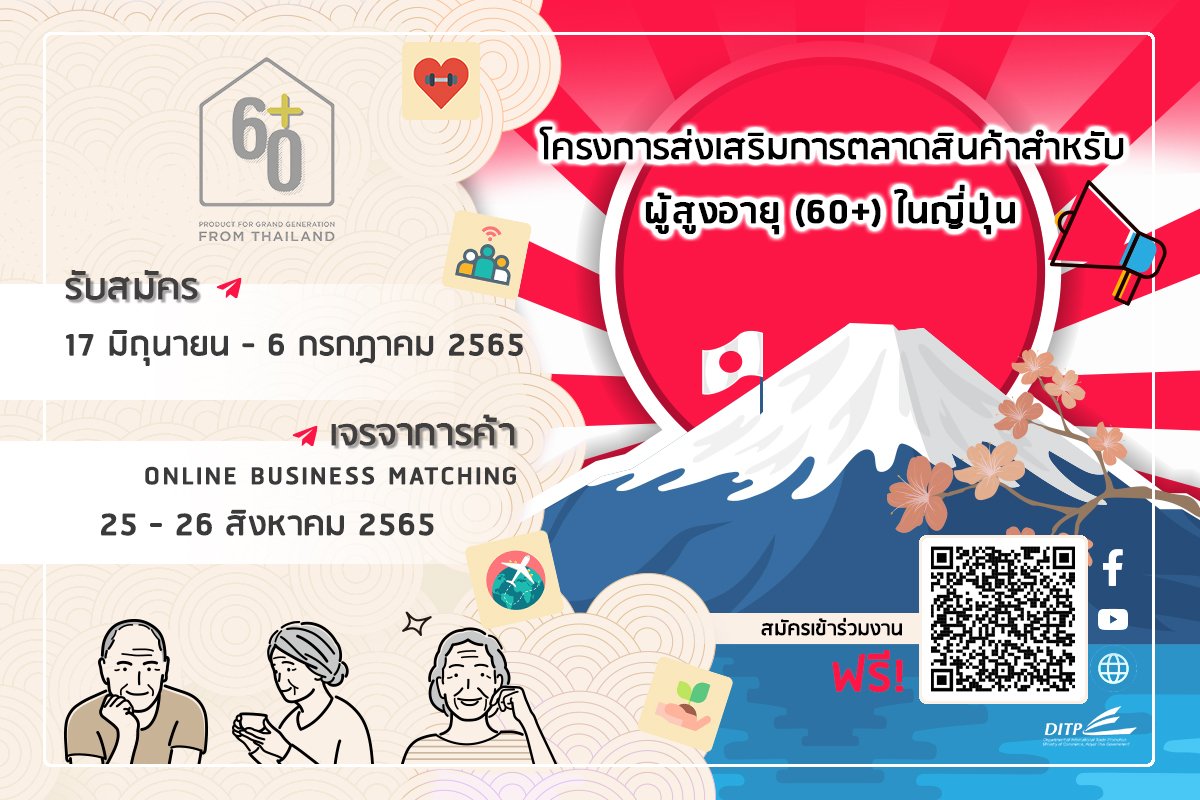 กรมส่งเสริมการค้าระหว่างประเทศ ขอเชิญทุกท่านสมัครเข้าร่วมโครงการส่งเสริมการตลาดสินค้าสำหรับผู้สูงอายุ (60+) ในญี่ปุ่น เพื่อสร้างโอกาสทางการค้า ประชาสัมพันธ์สินค้าสู่ตลาดญี่ปุ่น และเพิ่มมูลค่าการส่งออก ผ่านการเจรจาการค้าออนไลน์ (Online Business Matching) กับผู้นำเข้าญี่ปุ่น สมัครได้แล้วตั้งแต่วันนี้ – 7 ก.ค. 2565 (ไม่มีค่าใช้จ่าย) วันเจรจาการค้า วันที่ 25-26 สิงหาคม 2565
