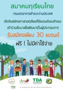 สมาคมทุเรียนไทย ร่วมกับ กรมเจรจาการค้าระหว่างประเทศ สมาคมผู้ผลิตทุเรียนไทย สมาพันธ์ชาวสวนทุเรียนไทย ภาคตะวันออก เปิดลงทะเบียนรับสมัครชาวสวนทุเรียนที่มีแบรนด์ของตัวเอง เข้าร่วมงานสัมนาพัฒนาจากชาวสวนเป็นผู้ประกอบการ เปิดลงทะเบียนเพียง 30 ที่นั่ง ( 30 แบรนด์ ) เท่านั้น