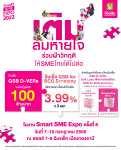 ธนาคารออมสิน จัดโปรโมชันในงาน Smart SME Expo 2022 ระหว่างวันที่ 7-10 กรกฎาคม 2565 ณ ฮอลล์ 7 – 8 อิมแพ็ค เมืองทองธานี