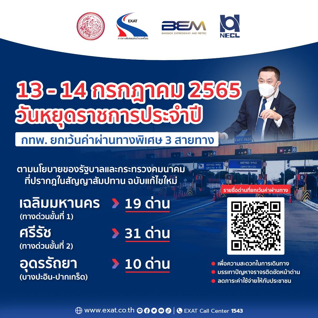 การทางพิเศษแห่งประเทศไทย เปิดเผยวันที่ 13-14 กรกฎาคม 2565 ยกเว้นค่าผ่านทางพิเศษ 3 สายทาง