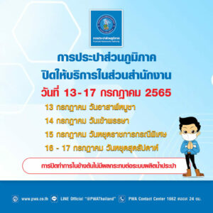การประปาส่วนภูมิภาค แจ้งปิดทำการในส่วนสำนักงาน ในวันที่ 13 – 17 กรกฎาคม 2565
