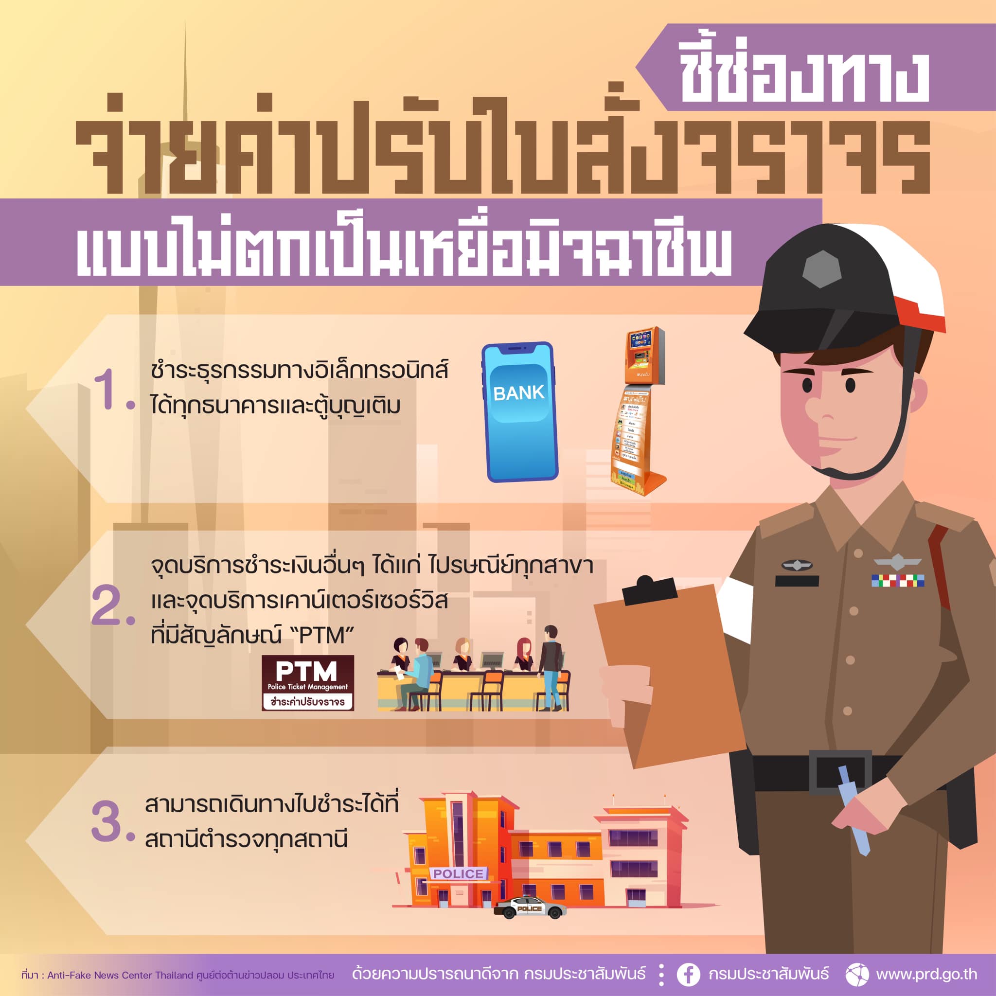 กรมประชาสัมพันธ์ แนะนำช่องทางจ่ายค่าปรับใบสั่งจราจร แบบไม่ตกเป็นเหยื่อมิจฉาชีพ ข่าวสารกิจกรรม กรมประชาสัมพันธ์ แนะนำช่องทางจ่ายค่าปรับใบสั่งจราจร แบบไม่ตกเป็นเหยื่อมิจฉาชีพ กรมประชาสัมพันธ์ แนะนำช่องทางจ่ายค่าปรับใบสั่งจราจร แบบไม่ตกเป็นเหยื่อมิจฉาชีพ1. ชำระธุรกรรมทางอิเล็กทรอนิกส์ได้ทุกธนาคาร และตู้บุญเติม2. จุดบริการชำระเงินอื่นๆ ได้แก่ ไปรษณีย์ทุกสาขา และจุดบริการเคาน์เตอร์เซอร์วิส ที่มีสัญลักษณ์ “PTM”3. สามารถเดินทางไปชำระได้ที่สถานีตำรวจทุกสถานี ที่มา : https://bit.ly/3cmeNUF Post Views: 314 FacebookFacebookXTwitterLINELine