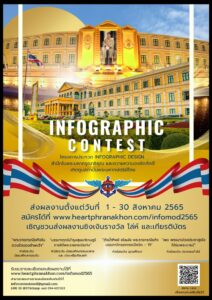 สำนักงานปลัดกระทรวงกลาโหม โดยสำนักงานเลขานุการสำนักงานปลัดกระทรวงกลาโหม ขอเชิญชวนส่งผลงานอินโฟกราฟิก เข้าประกวดในโครงการเฉลิมพระเกียรติพระบาทสมเด็จพระเจ้าอยู่หัวและสถาบันพระมหากษัตริย์ ผู้ที่สนใจสามารถส่งผลงานเข้าประกวดได้ตั้งแต่วันนี้จนถึงวันที่ 30 สิงหาคม 2565 สนใจดูรายละเอียดเพิ่มเติมได้ที่ https://www.heartphranakhon.com/infomod2565/