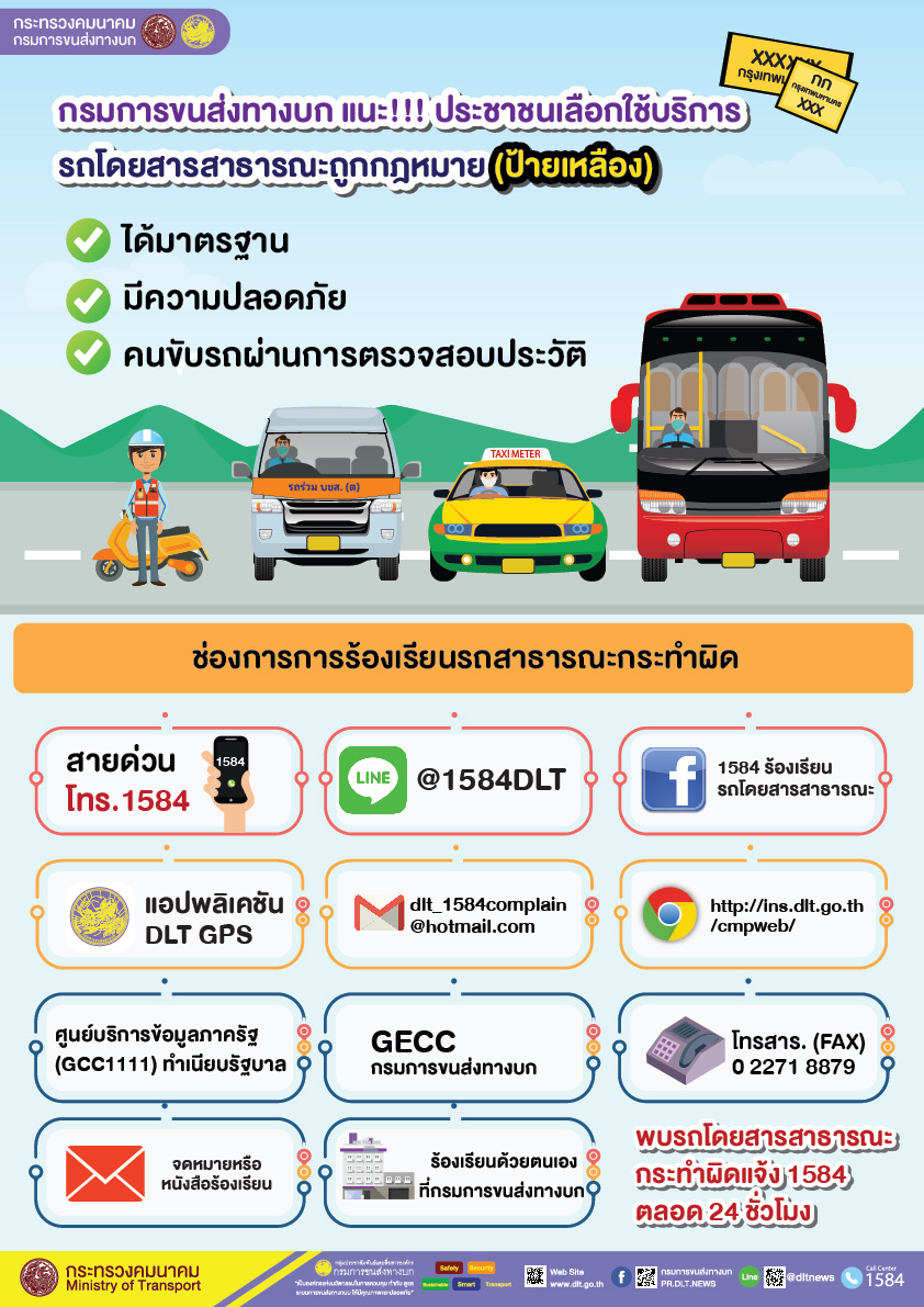 กรมการขนส่งทางบก แนะนำประชาชนเลือกใช้บริการรถโดยสารสาธารณะ ถูกกฎหมาย (ป้ายเหลือง) ได้มาตรฐาน มีความปลอดภัย คนขับรถผ่านการตรวจสอบประวัติ
