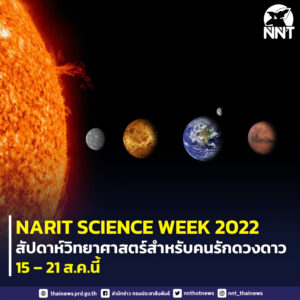 สถาบันวิจัยดาราศาสตร์แห่งชาติ (องค์การมหาชน) เชิญชวนเยาวชนและประชาชน ร่วมงาน “NARIT SCIENCE WEEK 2022” สัปดาห์วิทยาศาสตร์สำหรับคนรักดวงดาว ระหว่างวันที่ 15 – 21 สิงหาคม 2565 ตั้งแต่เวลา 09:00 – 17:00 น. พร้อมกันทั้งส่วนกลางและภูมิภาค 4 แห่ง ได้แก่ อุทยานดาราศาสตร์สิรินธร อ.แม่ริม จ.เชียงใหม่ หอดูดาวเฉลิมพระเกียรติ 7 รอบ พระชนมพรรษา นครราชสีมา ฉะเชิงเทรา และสงขลา