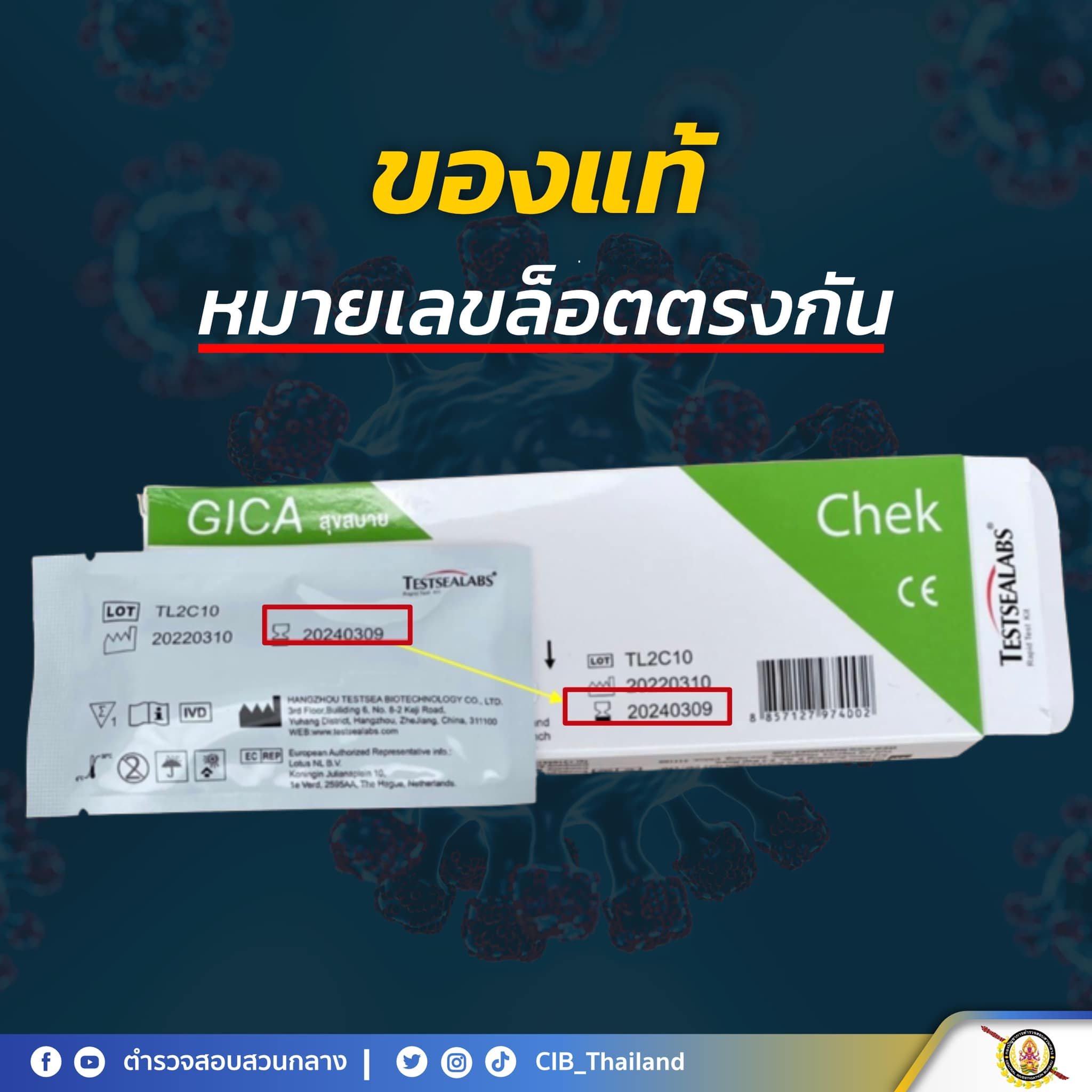 ช่วงนี้มีการลักลอบผลิตชุดตรวจ ATK ปลอม หลอกขายให้กับประชาชนผ่านแพลตฟอร์มออนไลน์เป็นจำนวนมาก ตำรวจสอบสวนกลาง (CIB) จึงขอแนะนำวิธีสังเกตเบื้องต้น ว่า ATK แบบไหนจริง ATK แบบไหนปลอม โดยให้สังเกตหมายเลขล็อตที่กล่องชุดตรวจโควิด กับหมายเลขล็อตซองบรรจุภัณฑ์ด้านใน หากเป็นของจริง หมายเลขล็อตจะต้องตรงกัน