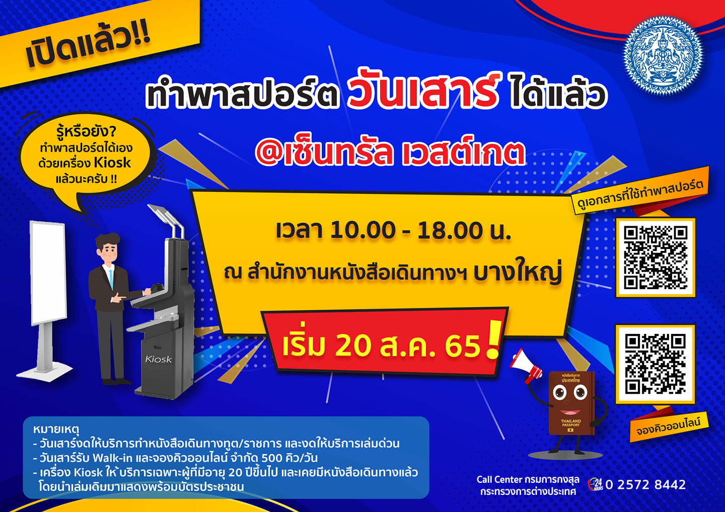 กรมการกงสุล กระทรวงการต่างประเทศ เปิดทำพาสปอร์ตวันเสาร์ได้แล้ว ที่เซ็นทรัลเวสต์เกต เวลา 10.00 – 18.00 น. ณ สำนักงานหนังสือเดินทางฯ บางใหญ่ เริ่มวันที่ 20 ส.ค. 65 นี้