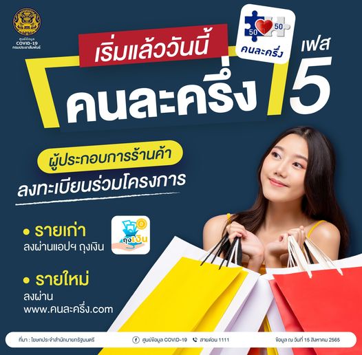 โฆษกประจำสำนักนายกรัฐมนตรี เปิดเผย “คนละครึ่งเฟส 5” เปิดให้ผู้ประกอบการร้านค้า ลงทะเบียนร่วมโครงการ วันนี้วันแรก (15 ส.ค.65)