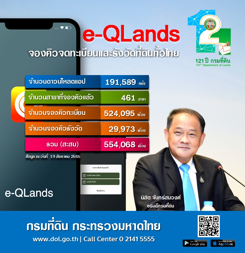 นายนิสิต จันทร์สมวงศ์ อธิบดีกรมที่ดิน เผยว่าจากสถานการณ์การแพร่ระบาดของโควิด 19 และกระแสการเปลี่ยนแปลงทางด้านเทคโนโลยีดิจิทัล (Digital Transformation) ทำให้กรมที่ดินได้พัฒนาแอปพลิเคชัน “e-QLands” ขึ้น เพื่อรองรับการให้บริการประชาชนได้สะดวกสบายมากยิ่งขึ้น ซึ่งเริ่มใช้งานเมื่อวันที่ 3 กุมภาพันธ์ 2564 ที่ผ่านมา โดยรัฐมนตรีว่าการกระทรวงมหาดไทย (พลเอก อนุพงษ์ เผ่าจินดา) เป็นประธานในพิธีเปิดตัวแอปพลิเคชัน (Kick off) และจากข้อมูล ณ วันที่ 19 สิงหาคม 2565 มีประชาชนดาวน์โหลดแอปพลิเคชัน “e-QLands” แล้ว 191,589 ครั้ง ทำการจองคิวครบแล้วทั้ง 461 สำนักงานที่ดินทุกแห่งทั่วประเทศ รวมคิวสะสม 554,068 เรื่อง แบ่งเป็นจองคิวจดทะเบียน 524,095 เรื่อง และจองคิวรังวัดที่ดิน 29,973 เรื่อง