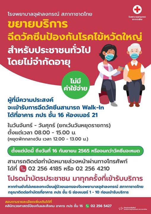 โรงพยาบาลจุฬาลงกรณ์ สภากาชาดไทย ขอเชิญชวนประชาชนทั่วไป โดยไม่จำกัดอายุ เข้ารับการฉีดวัคซีนป้องกันโรคไข้หวัดใหญ่ ฟรี ไม่มีค่าใช้จ่าย ผู้ที่มีความประสงค์จะเข้ารับการฉีดวัคซีน Walk-In ได้ที่อาคาร ภปร ชั้น 16 ห้องเบอร์ 21 ในวันจันทร์ – วันศุกร์ (ยกเว้นวันหยุดราชการ) ตั้งแต่เวลา 08.00 – 15.00 น. (หยุดพักกลางวัน เวลา 12.00 – 13.00 น.) ตั้งแต่บัดนี้ – 16 กันยายน 2565 หรือจนกว่าวัคซีนจะหมด
