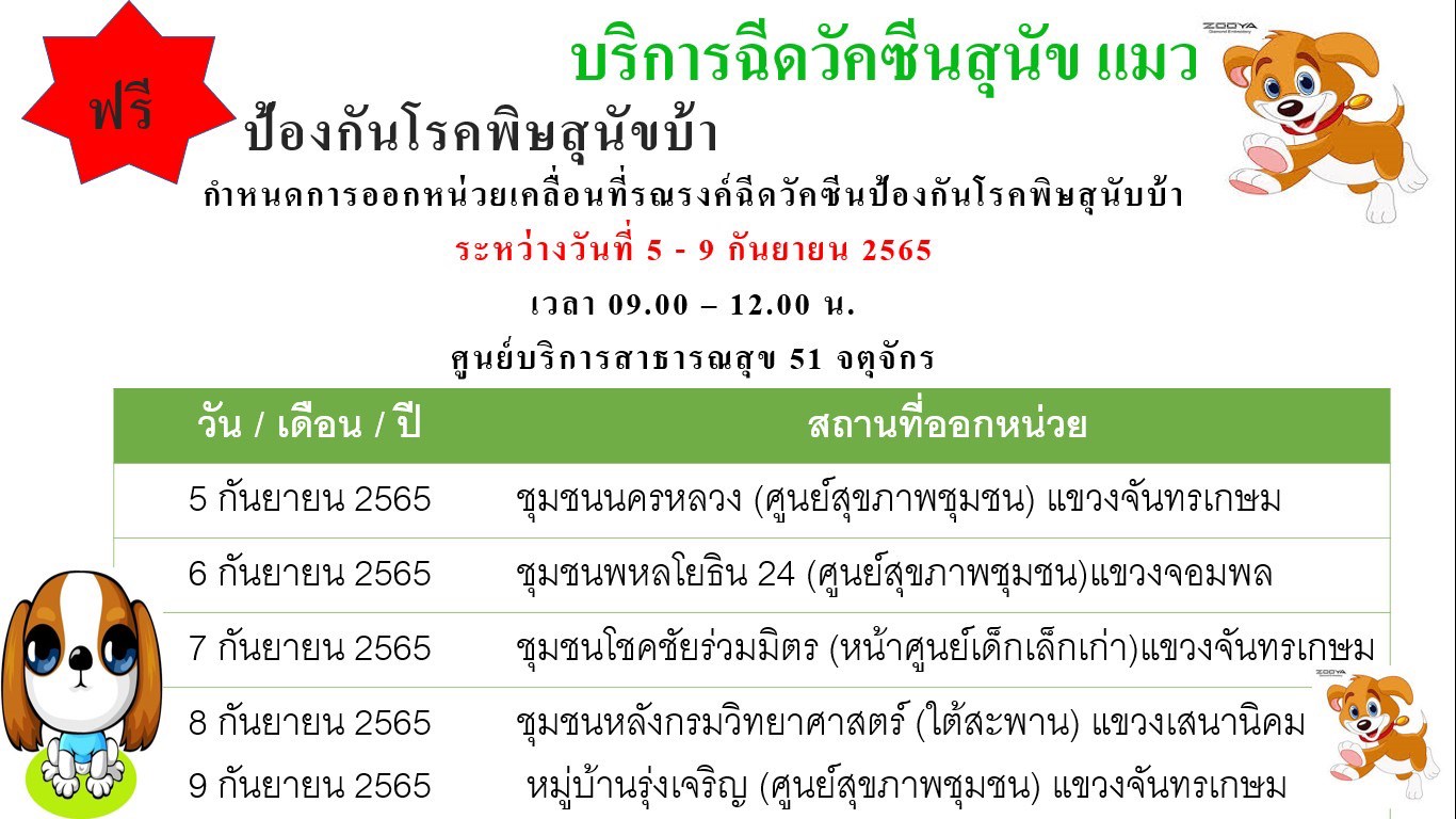 สำนักงานเขตจตุจักร ร่วมศูนย์บริการสาธารณสุข 51 (จตุจักร) จัดหน่วยเคลื่อนที่ให้บริการฉีดวัคซีนป้องกันโรคพิษสุนัขบ้าในสัตว์เลี้ยงในพื้นที่เขตจตุจักร จึงขอเชิญชวนประชาชนนำสัตว์เลี้ยง สุนัขและแมวที่มีสุขภาพแข็งแรง อายุ 3 เดือนขึ้นไป ไปฉีดวัคซีนป้องกันโรคพิษสุนัขบ้าที่หน่วยบริการฉีดวัคซีนฯ เคลื่อนที่ใกล้บ้านท่าน โดยไม่เสียค่าใช้จ่าย ตั้งแต่วันที่ 5 – 16 กันยายน 2565 เวลา 09.00 – 12.00 น.