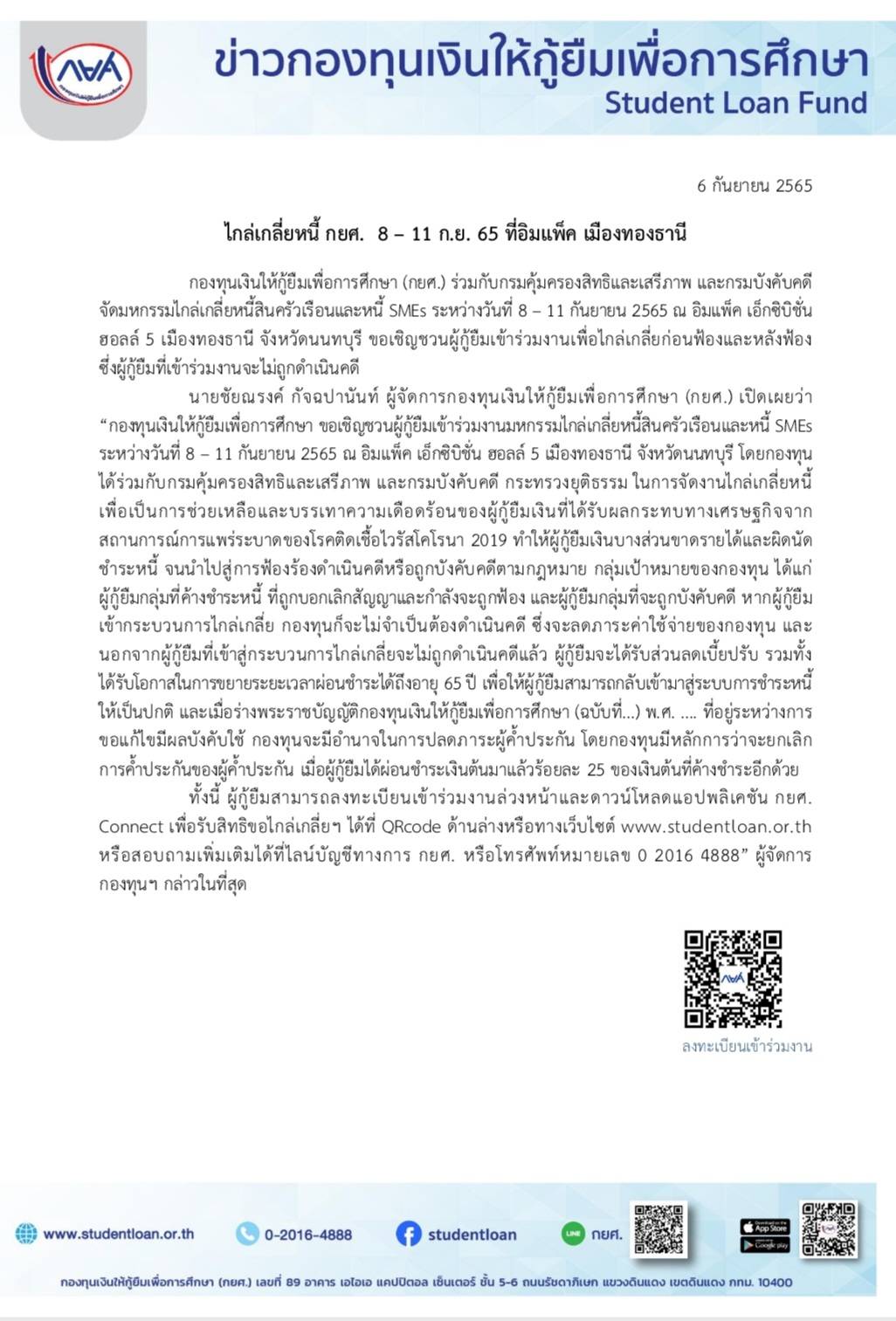 นายชัยณรงค์ กัจฉปานันท์ ผู้จัดการกองทุนเงินให้กู้ยืมเพื่อการศึกษา (กยศ.) เปิดเผยว่า “กองทุนเงินให้กู้ยืมเพื่อการศึกษา ขอเชิญชวนผู้กู้ยืมเข้าร่วมงานมหกรรมไกล่เกลี่ยหนี้สินครัวเรือนและหนี้ SMEs ระหว่างวันที่ 8 – 11 กันยายน 2565 ณ อิมแพ็ค เอ็กซิบิชั่น ฮอลล์ 5 เมืองทองธานี จังหวัดนนทบุรี โดยกองทุนได้ร่วมกับกรมคุ้มครองสิทธิและเสรีภาพ และกรมบังคับคดี กระทรวงยุติธรรม ในการจัดงานไกล่เกลี่ยหนี้ เพื่อเป็นการช่วยเหลือและบรรเทาความเดือดร้อนของผู้กู้ยืมเงินที่ได้รับผลกระทบทางเศรษฐกิจจากสถานการณ์การแพร่ระบาดของโรคติดเชื้อไวรัสโคโรนา 2019 ทำให้ผู้กู้ยืมเงินบางส่วนขาดรายได้และผิดนัดชำระหนี้ จนนำไปสู่การฟ้องร้องดำเนินคดีหรือถูกบังคับคดีตามกฎหมาย กลุ่มเป้าหมายของกองทุน ได้แก่ ผู้กู้ยืมกลุ่มที่ค้างชำระหนี้ ที่ถูกบอกเลิกสัญญาและกำลังจะถูกฟ้อง และผู้กู้ยืมกลุ่มที่จะถูกบังคับคดี หากผู้กู้ยืม เข้ากระบวนการไกล่เกลี่ย กองทุนก็จะไม่จำเป็นต้องดำเนินคดี ซึ่งจะลดภาระค่าใช้จ่ายของกองทุน และนอกจากผู้กู้ยืมที่เข้าสู่กระบวนการไกล่เกลี่ยจะไม่ถูกดำเนินคดีแล้ว ผู้กู้ยืมจะได้รับส่วนลดเบี้ยปรับ รวมทั้งได้รับโอกาสในการขยายระยะเวลาผ่อนชำระได้ถึงอายุ 65 ปี เพื่อให้ผู้กู้ยืมสามารถกลับเข้ามาสู่ระบบการชำระหนี้ให้เป็นปกติ และเมื่อร่างพระราชบัญญัติกองทุนเงินให้กู้ยืมเพื่อการศึกษา (ฉบับที่…) พ.ศ. …. ที่อยู่ระหว่างการขอแก้ไขมีผลบังคับใช้ กองทุนจะมีอำนาจในการปลดภาระผู้ค้ำประกัน โดยกองทุนมีหลักการว่าจะยกเลิก การค้ำประกันของผู้ค้ำประกัน เมื่อผู้กู้ยืมได้ผ่อนชำระเงินต้นมาแล้วร้อยละ 25 ของเงินต้นที่ค้างชำระอีกด้วย