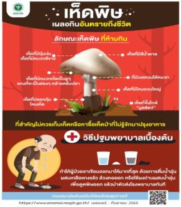 “ทั้งนี้ ลักษณะเห็ดพิษที่พอสังเกตได้ คือ มีสีสัน หากกินเห็ดเข้าไปแล้วมีอาการคลื่นไส้ อาเจียน ท้องเสีย ควรปฐมพยาบาลเบื้องต้น โดยให้เตรียมน้ำอุ่นผสมผงถ่าน activated charcoal แล้วดื่ม 2 แก้ว ซึ่งแก้วแรกให้ล้วงคอให้อาเจียนออกมาเสียก่อน แล้วจึงดื่มแก้วที่ 2 แล้วล้วงคอให้อาเจียนออกมาอีกครั้ง ไม่ควรใช้ไข่ขาวดิบจะยิ่งทำให้ผู้ป่วยท้องเสียเพิ่ม หรือติดเชื้อได้ จากนั้นให้รีบพาผู้ป่วยไปโรงพยาบาลทันที และแจ้งประวัติ การกินเห็ดโดยละเอียด พร้อมนำตัวอย่างหรือภาพถ่ายเห็ดไปด้วย เพื่อรับการรักษาได้อย่างถูกวิธี” อธิบดีกรมอนามัย กล่าว
