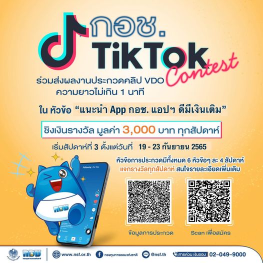 กองทุนการออมแห่งชาติ (กอช.) จัดกิจกรรม “กอช. TikTok Contest” เพื่อให้ประชาชนทั่วไปส่งผลงานเข้าร่วมประกวดคลิป VDO ความยาวไม่เกิน 1 นาที ผ่านแพลตฟอร์ม TikTok ในหัวข้อที่ 6 “แนะนำ App. กอช. แอปดีมีเงินเติม” ชิงเงินรางวัล มูลค่า 3,000 บาท ทุกสัปดาห์ เริ่มต้นสัปดาห์ที่ 3 วันที่ 19 – 23 กันยายน 2565 หัวข้อการประกวดมีทั้งหมด 6 หัวข้อๆ ละ 4 สัปดาห์ แจกรางวัลทุกสัปดาห์
