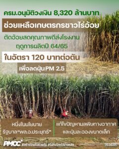 คณะรัฐมนตรี มีมติอนุมัติในหลักการโครงการช่วยเหลือเกษตรกรชาวไร่อ้อยตัดอ้อยสดคุณภาพดี เพื่อลดฝุ่น PM 2.5 ฤดูการผลิตปี 2564/2565 ภายในกรอบวงเงินโครงการ 8,319.24 ล้านบาท และตอบสนองนโยบายรัฐบาลในการแก้ไขปัญหามลพิษด้าน ฝุ่นละอองขนาดเล็ก (PM 2.5) เพื่อให้ความช่วยเหลือเกษตรกรชาวไร่อ้อยที่ตัดอ้อยสดเป็นกรณีเฉพาะเป็นการชั่วคราว