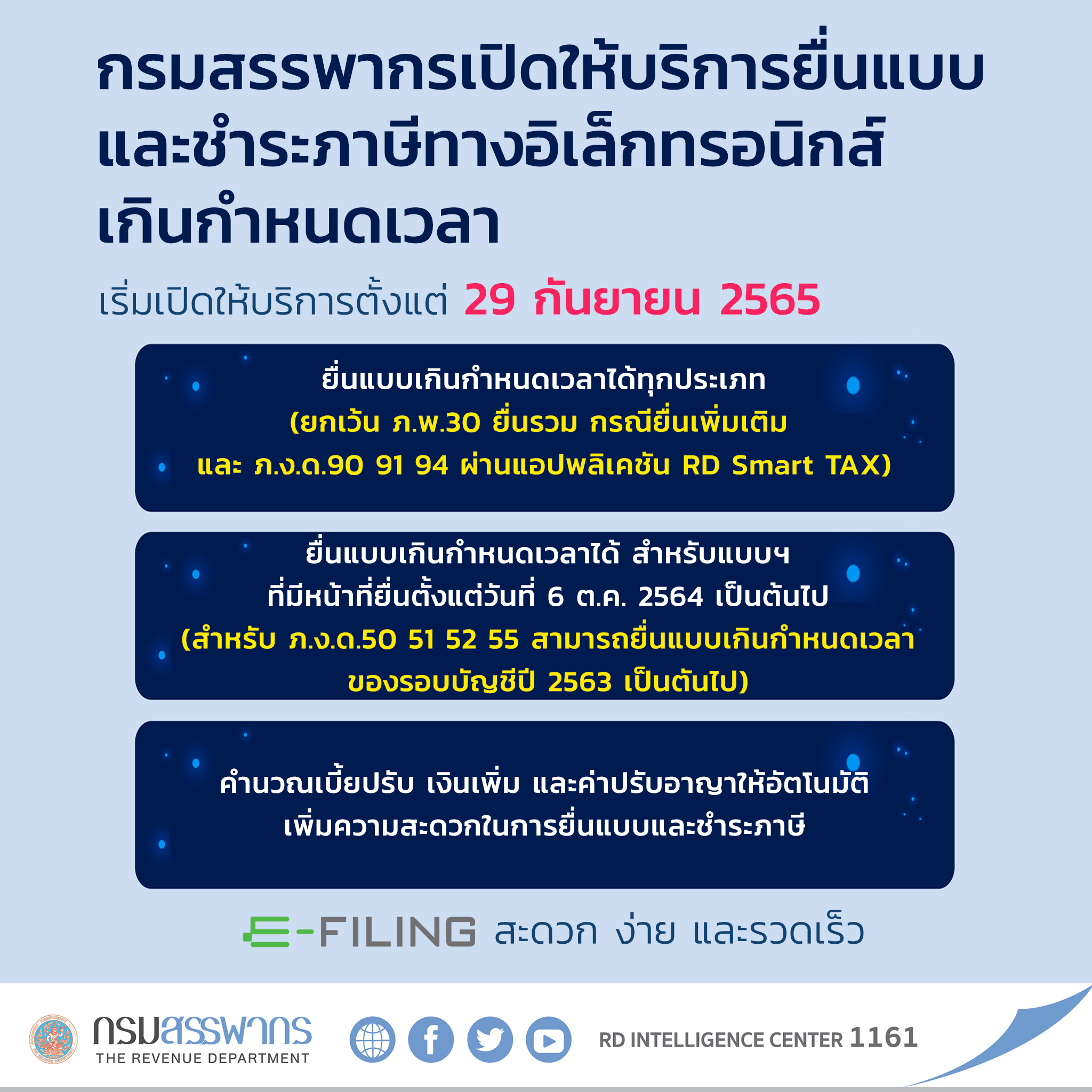 กรมสรรพากร เปิดให้บริการยื่นแบบยื่นแบบฯ ชำระภาษีทางอิเล็กทรอนิกส์ เกินกำหนดเวลาได้แล้ว ตั้งแต่วันที่ 29 กันยายน 2565 เป็นต้นไป
