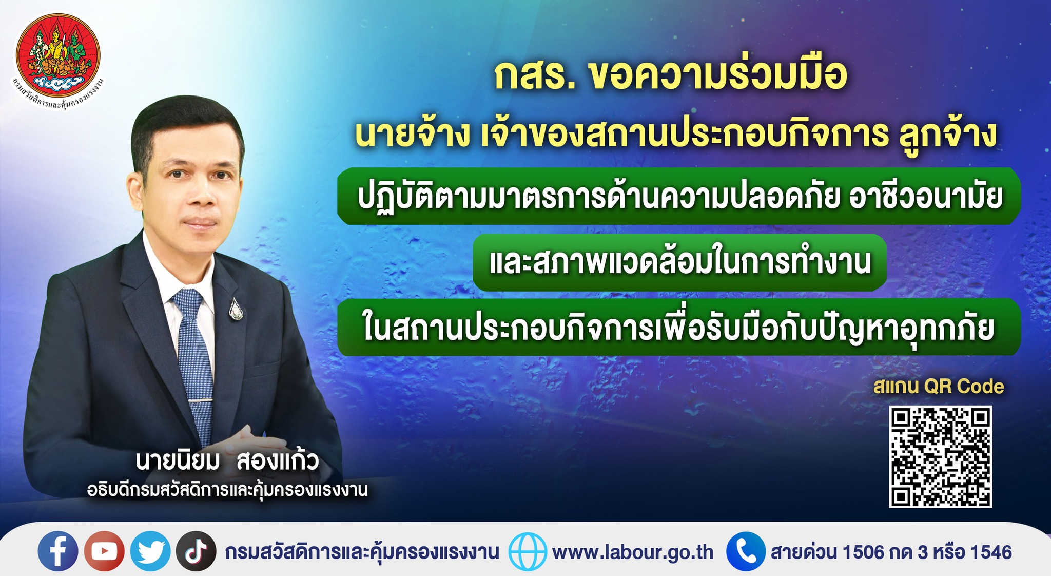 กรมสวัสดิการและคุ้มครองแรงงาน ขอความร่วมมือ นายจ้าง เจ้าของสถานประกอบกิจการ ลูกจ้าง ปฏิบัติตามมาตรการด้านความปลอดภัย อาชีวอนามัย และสภาพแวดล้อมในการทำงานในสถานประกอบกิจการเพื่อรับมือกับปัญหาอุทกภัย